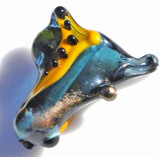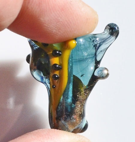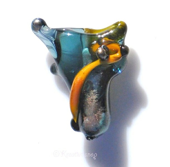 Et unikt lampwork anheng, laget av glass på åpen flamme. Ca 30x26mm. Kan brukes begge sider. ENten tre rett inn på en lærsnor eller kjede.Det er brent fast litt glitrende alvestøv.
