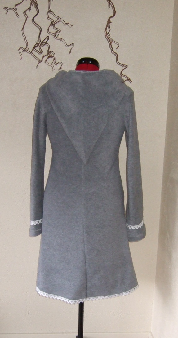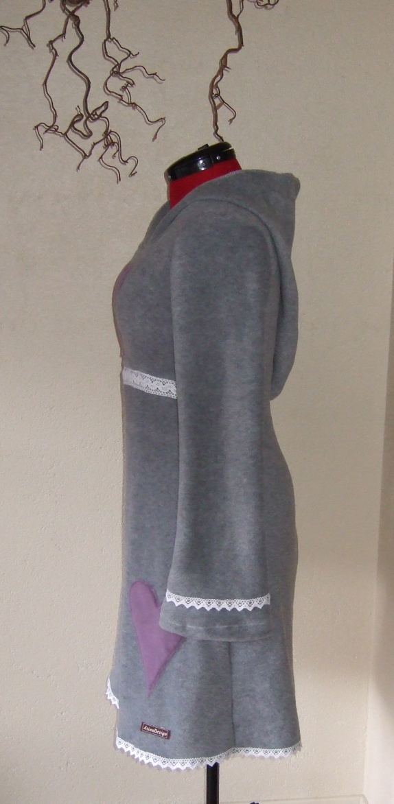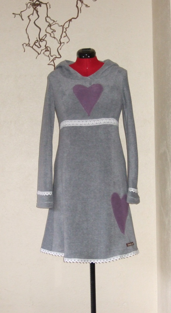 Denne fleecekjolen er både deilige, praktiske, flott og stilig. Den er sydd i gråmelert og lilla polarfleece, og pyntet med blonder. Bildet yter den ikke rettferd.