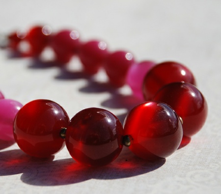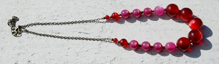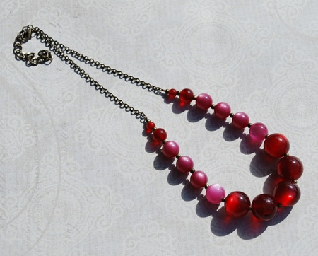 Perler i rødtoner, dyp rød, rødlilla, gradert fra ca 16 - 6mm store. Små messingperler mellom og et messingkjede.