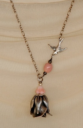 Forsølvet kjede med glassperler og en forsølvet fugl. Kjedet er ca 45 cm langt og kan justeres til ca 50cm. Rosen er ca 2cm.