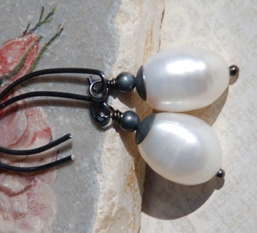 Store nydelige og litt røffe ferskvannsperler, ca 12mm, henger på antikkfarget sølv. De er totalt ca 43mm lange. Perlene kan også bestilles på mindre øreringer.