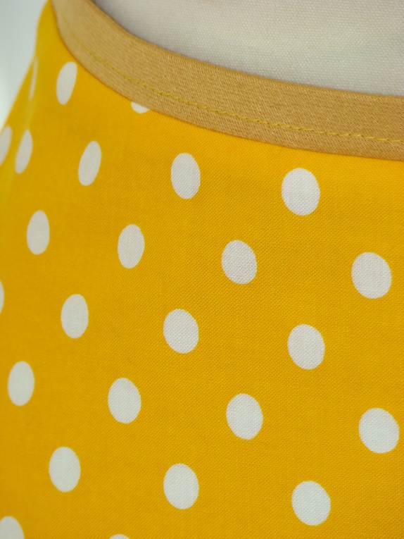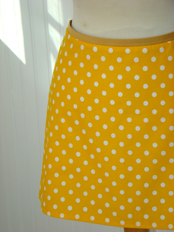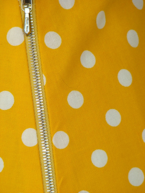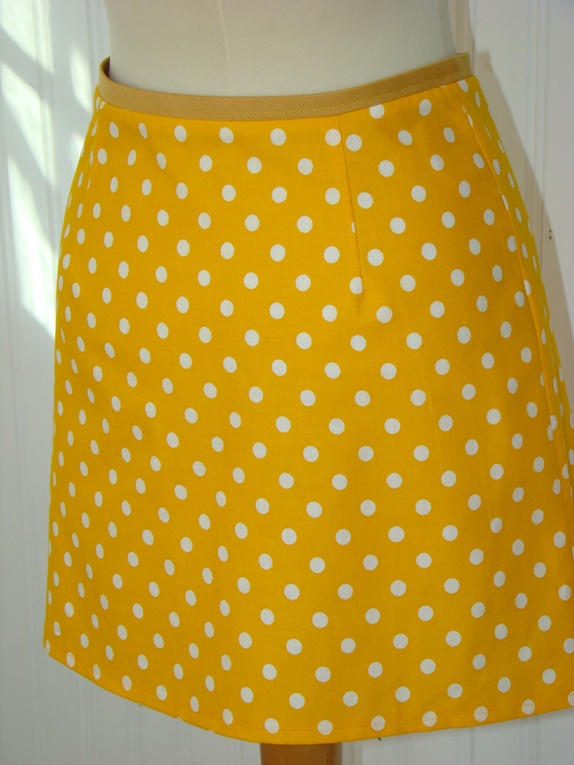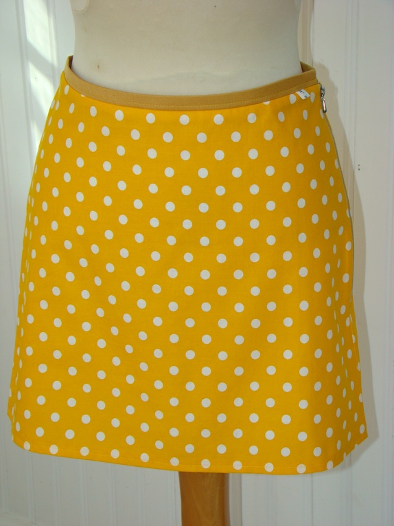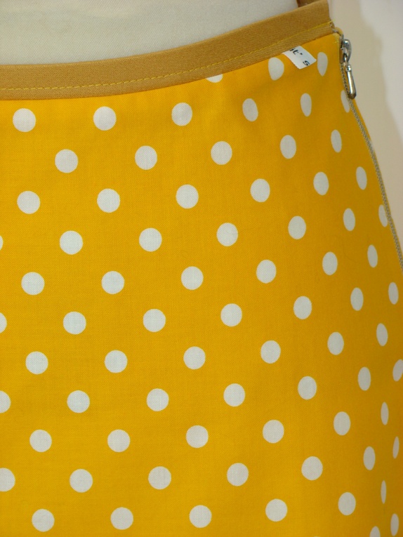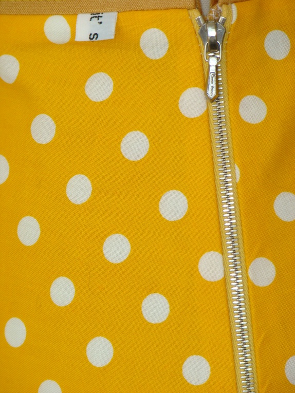 Miniskjørt sydd av gjenbrukt stoff. Stoffet er gult med hvite prikker og ser ubrukt ut. Bomull. Midjebånd i gull gulfarge. marineblå polyester / bomull. Vintageglidelås i metall i siden.