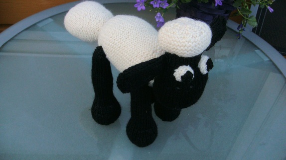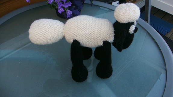 Sauen Shan er strikket i online garn og fylt med hobbyfyll.Shan er ca 19 cm høy og 22 cm lang. Han kan vaskes på 40 grader.
