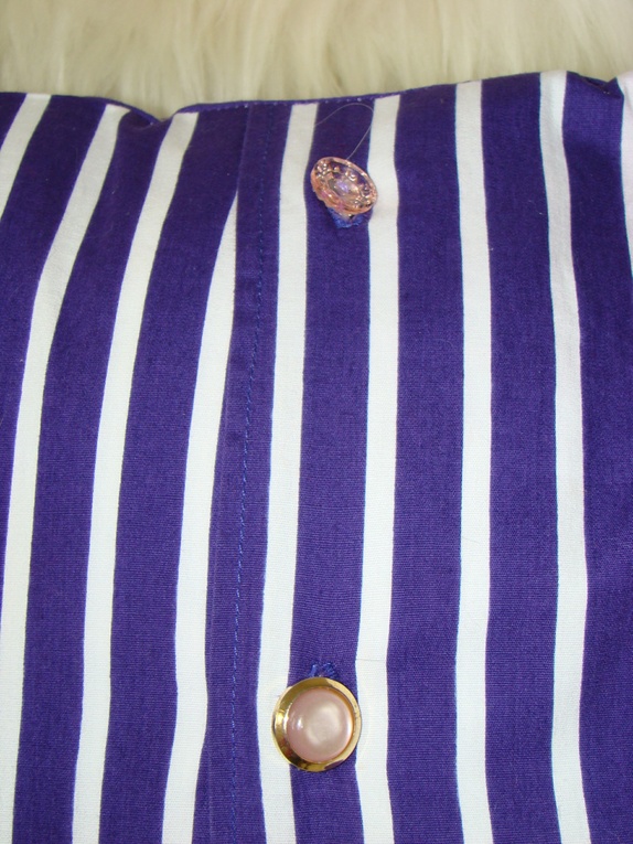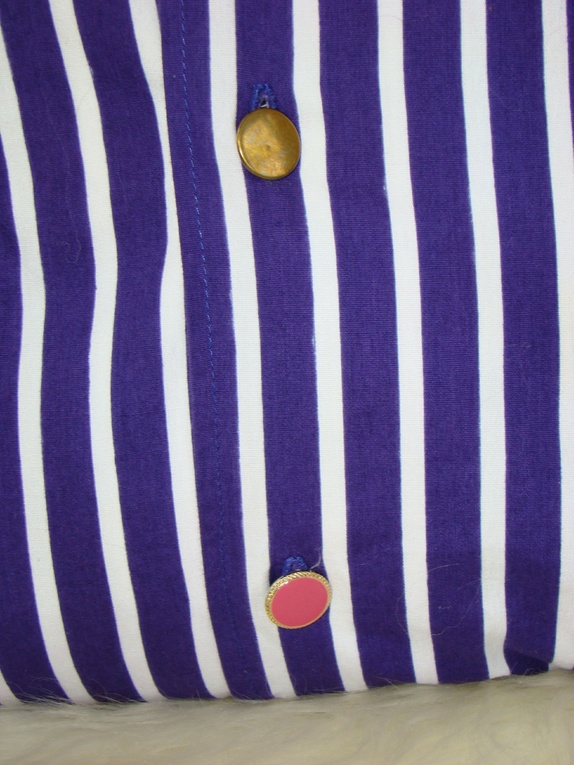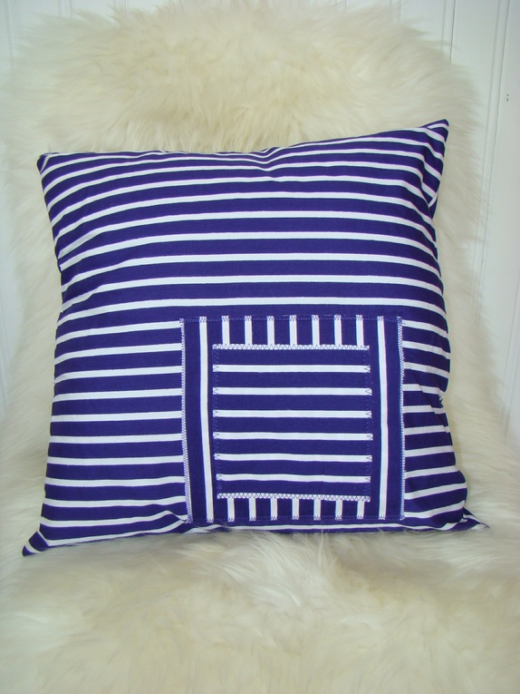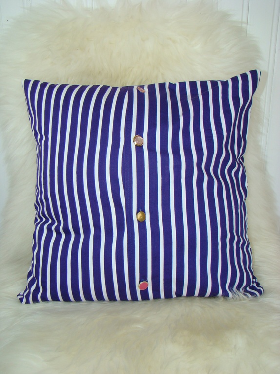 Denne lilla puten med hvite striper er sydd av en vintagekjole i finsk design. Påapplikert detalj på forsiden. Baksiden er også pen med knappeåpning og 4 forskjellige knapper i rosa, lilla og "gull". Stripene bak går vertikalt mens de foran går horisontalt for en litt artig effekt.