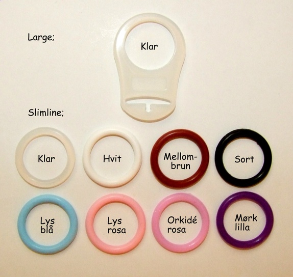 Smokkholderne kan fåes både med og uten silikonring, (uten koster 10kr mindre), så send meg en mail hvis uten er ønskelig. Silikonringen passer til alle MAM & NAN-smokker, og uten ring passer den til alle smokker med hank! Det finnes 2 forskjellige silikonringtyper, en slimline og en large. Slimline finnes i følgende farger; Klar, hvit, mellombrun, sort, lys blå, lys rosa, orkidé-rosa & mørk lilla. Large finnes kun i klar.