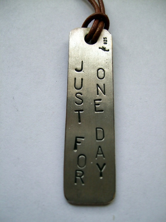 Halssmykke i oksydert sølv med lærreim i justerbar lengde i brunt. Tekst hentet fra David Bowies "Heroes".