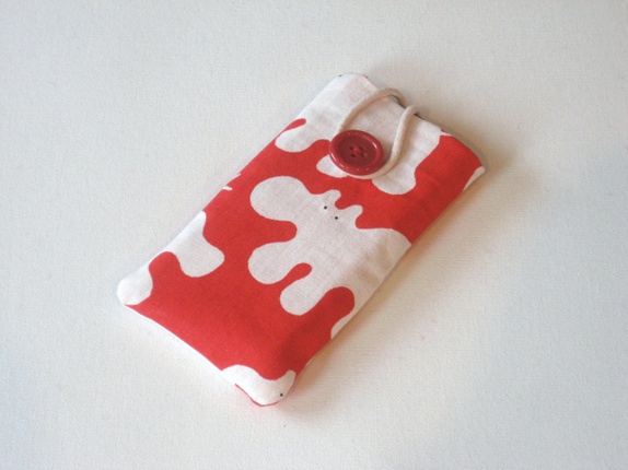 Gøyalt etui til mobiltelefon eller IPhone sydd i rød bomull med flodhester, fòret med rødmønstret bomull. Etuiet lukkes med en rød knapp.