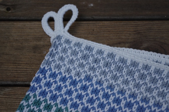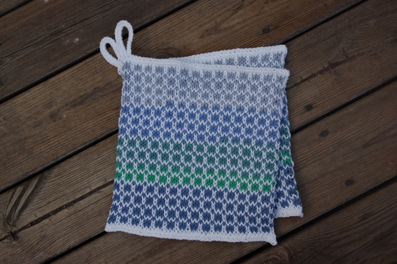 Håndstrikkede grytekluter i dobbelt bomullsgarn, garantert ingen brente fingre!