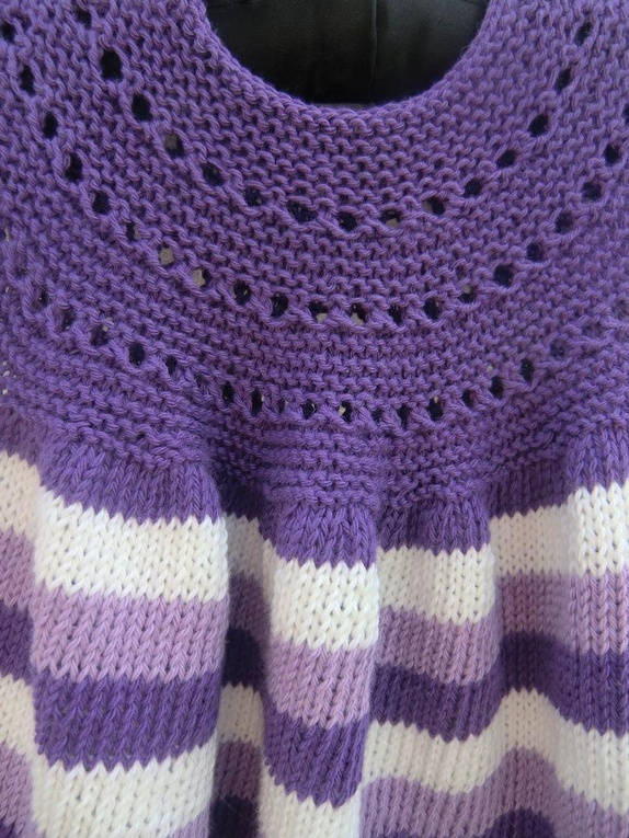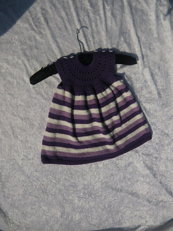 Søt sommerkjole strikket i tynt 100% bomullsgarn, deilig på varme sommerdager. Kan maskinvaskes på 60 grader. Strikket i fargene mørk lilla, lys lilla og hvit.