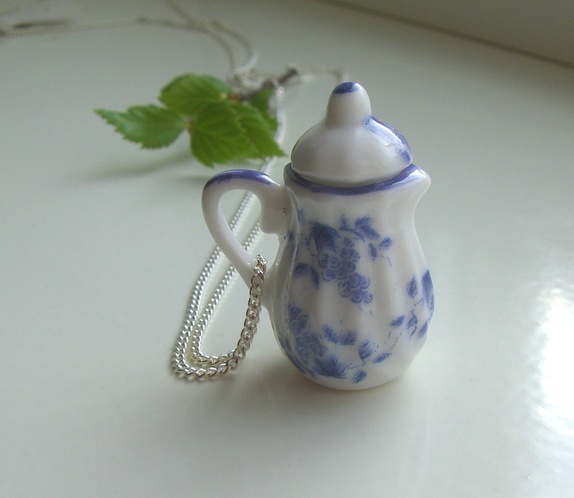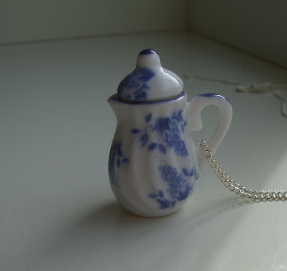 Bon Apetite ! En herlig gammeldags kaffekanne i Delph porselen fra Le Petit Cafè. Henger på sølvfarget lenke ca. 47 cm lang.