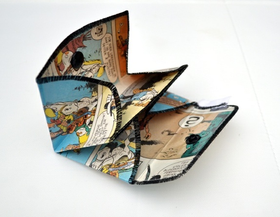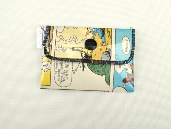 Denne lommeboken er laget av en gammel tegneserie side som har blitt laminert for å gjøre den holdbar. Den har to rom og plass til både bankkort, mynter og brettede sedler.