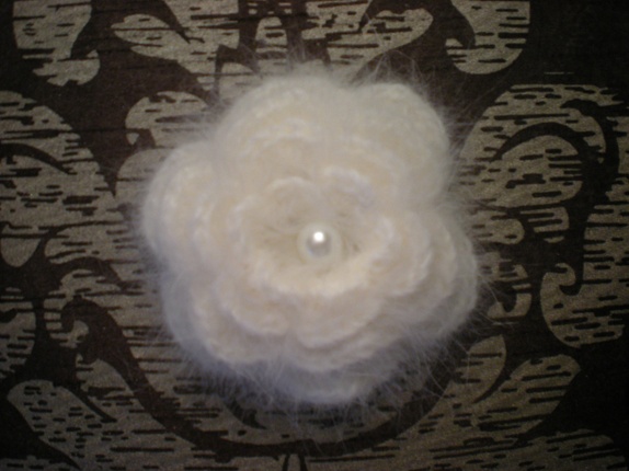 Heklet i 100% ekte angora kanin garn. Fjørlett og lekkert utseende med påsydd perle i midten og brosjenål bak.