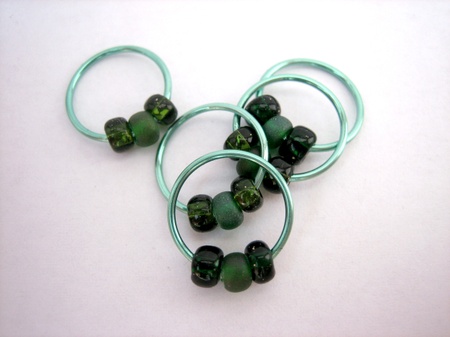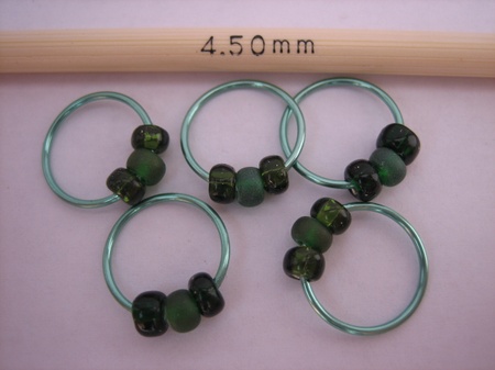 Det første bildet viser de markørene du vil motta. Det andre bildet viser de sammen med en 4.5mm strikkepinne, men de kan fint brukes på større pinner enn dette også. Det tredje viser en tilsvarende markør i et strikketøy på en 3.5mm pinne