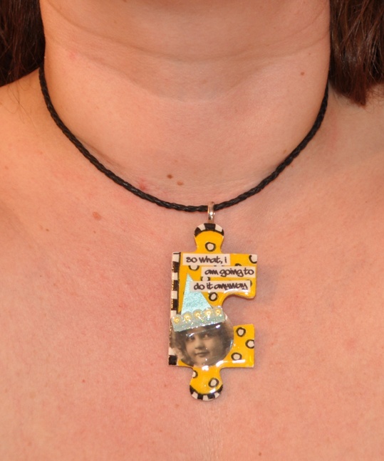 Motivet er limt på baksiden av brikken, sånn at det orginale motivet fortsatt finnes. Størrelsen på brikkene varierer litt, men for å få et visst inntrykk har jeg tatt bilde av en av de største rundt halsen.