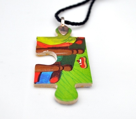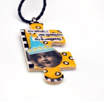 Dette anhenget består av en puslespill brikke som er dekorert med forskjellige ting som feks papir utklipp, servietter og bånd for å skape en liten unik og dekorativ collage.