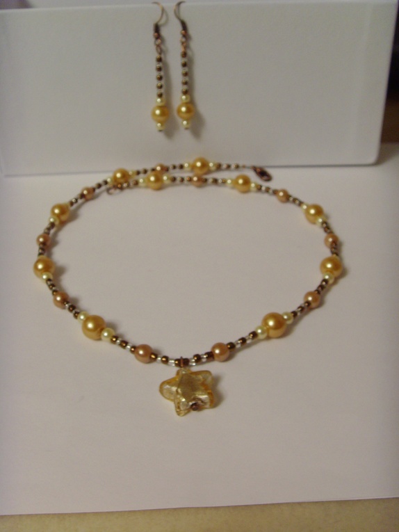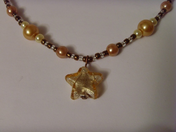 Kjedet består av litt større seed beads og glassperler i forskjellige størrelser. Fokusperlen er en ca 1 cm glass-stjerne med sølvfolie. Smykket er ca 43 cm langt.