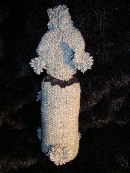 Strikket i perlestrikk m/ullgarn og perler til øyne og blondebånd som halsbånd.