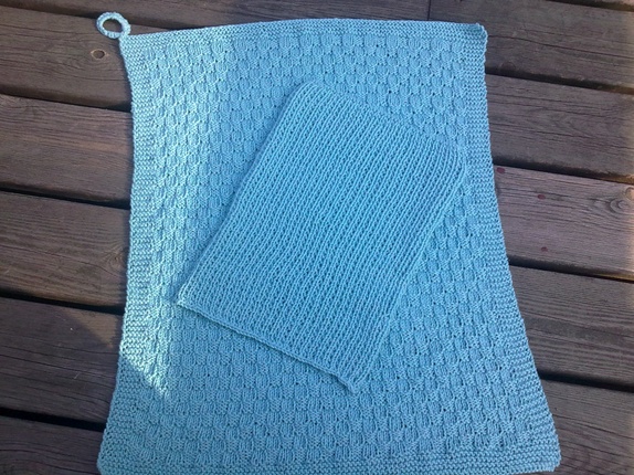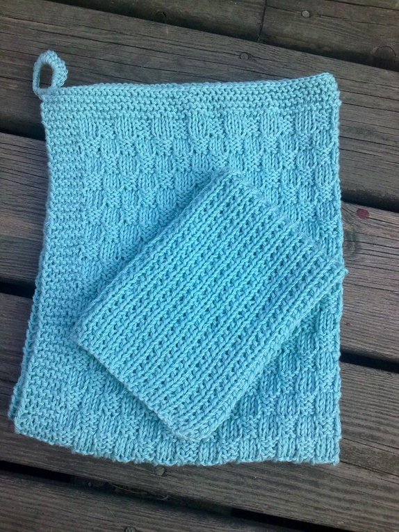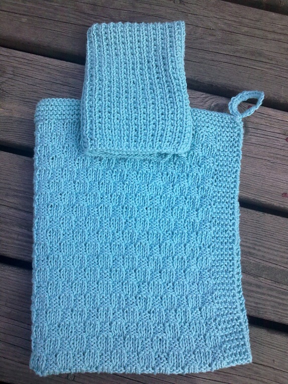 Strikket kjøkkensett bestående av 1 stk. kjøkkenhåndkle og 1 stk. klut. Strikket i 100 % bomull i fargen turkis. Kan vaskes på 60 grader og brukes igjen og igjen. Perfekt som gave til noen.