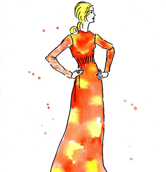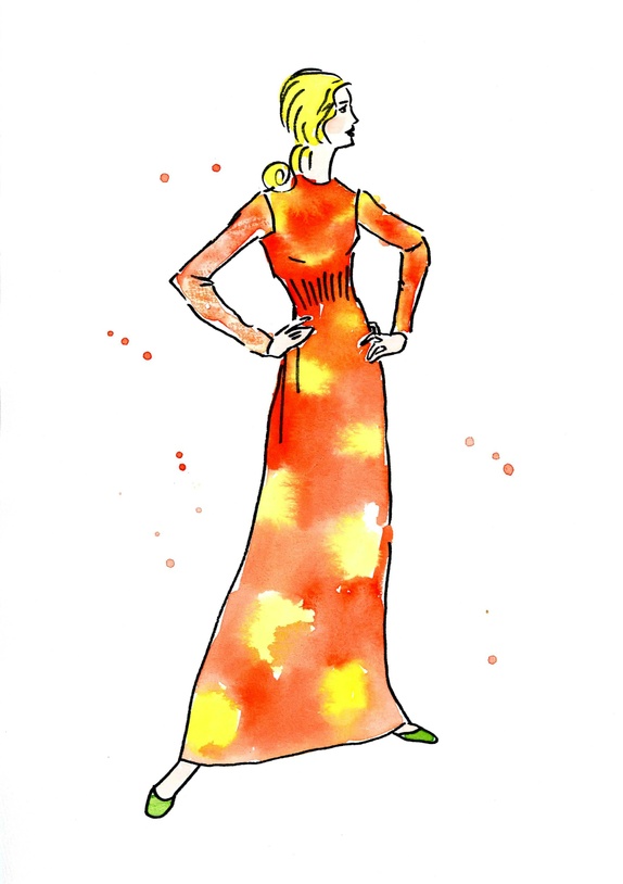 Moteillustrasjon, modell i orange og gul kjole, inspirert av illustrasjoner fra 60- og 70-tallet. Utført med akvarell og tusj på syrefritt 180 grams akvarellpapir.