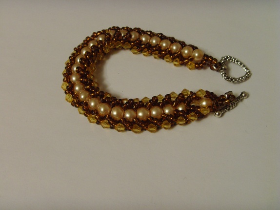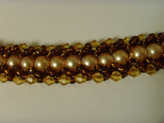 Seed-beadsene er i en brun tone, mens midtraden av runde perler er gylne.