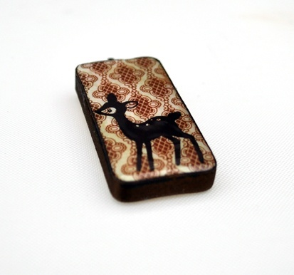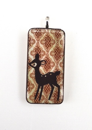 Dette anhenget består av en dominobrikke som er dekorert med forskjellige ting som feks papir utklipp, servietter og bånd for å skape en liten unik og dekorativ collage. Overflaten er beskyttet av dimensional lakk som gir motivet dybde.
