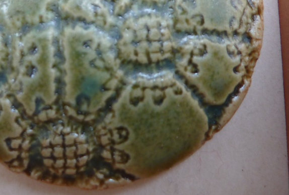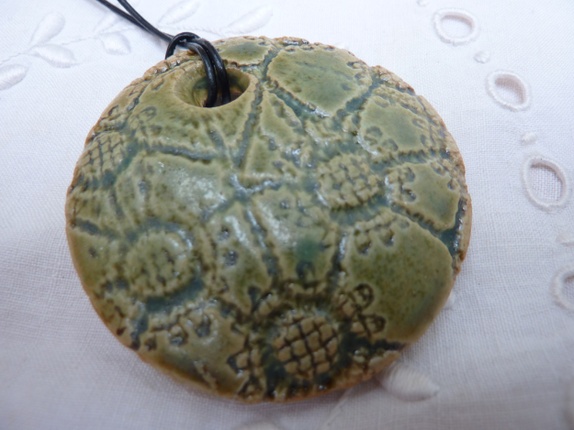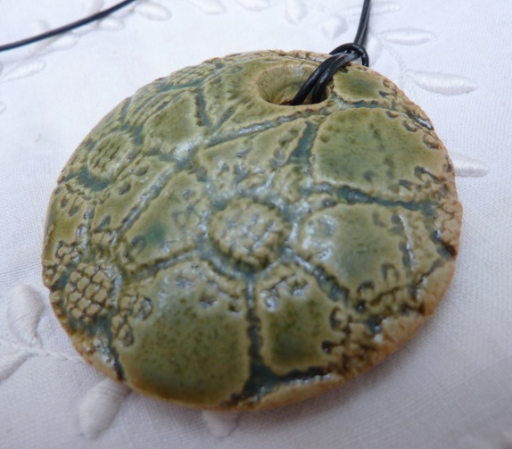 Halssmykke er laget av steingods som og har en diameter på 5,8 cm. Mosegrønne nyanser.Artig mønster.Sort lærsnor med regulerbar knute.