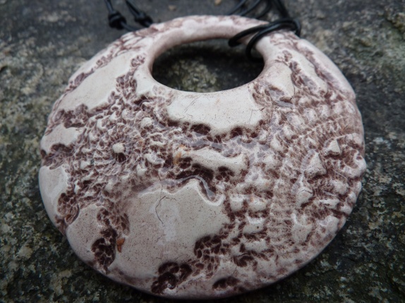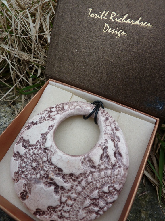 Halssmykket er laget av leirgods og har en diameter på 6.8 cm.Passer til de fleste anledninger.Sort lærsnor med regulerbar knute.Før kr 249,- Nå kr 159,-