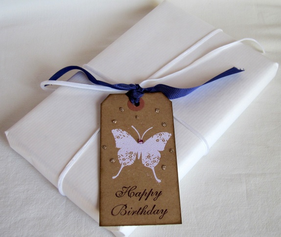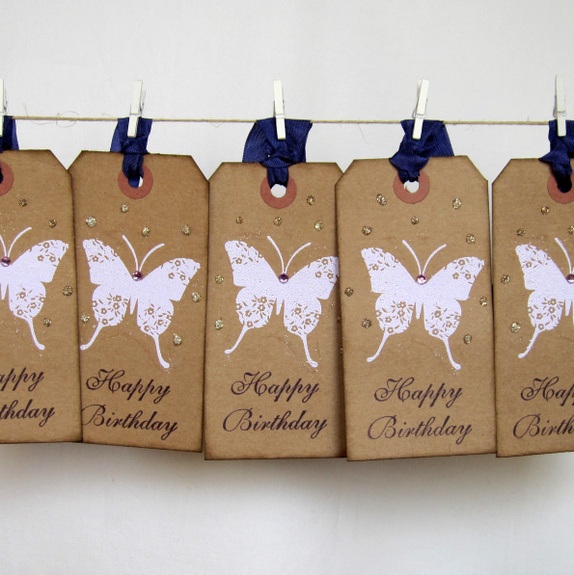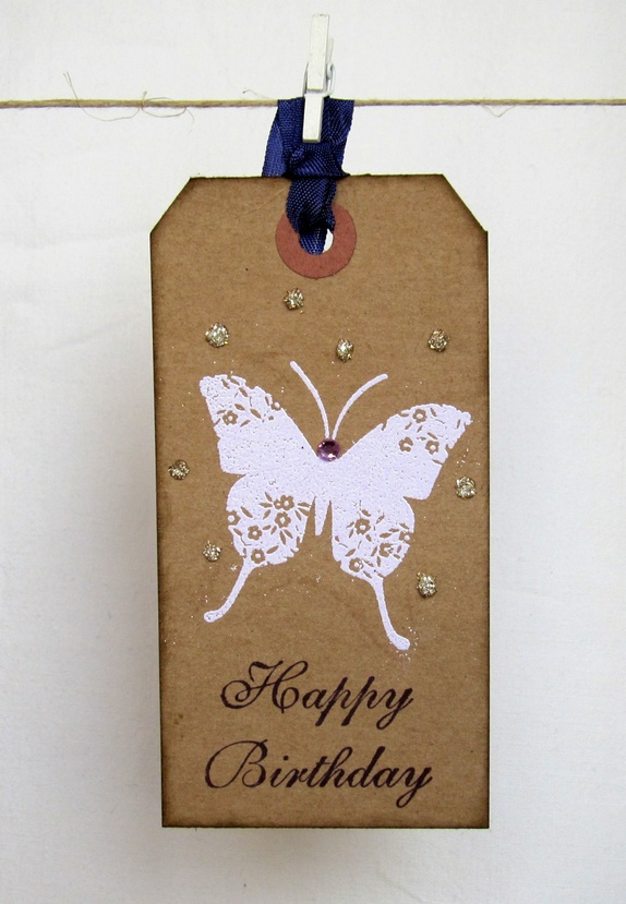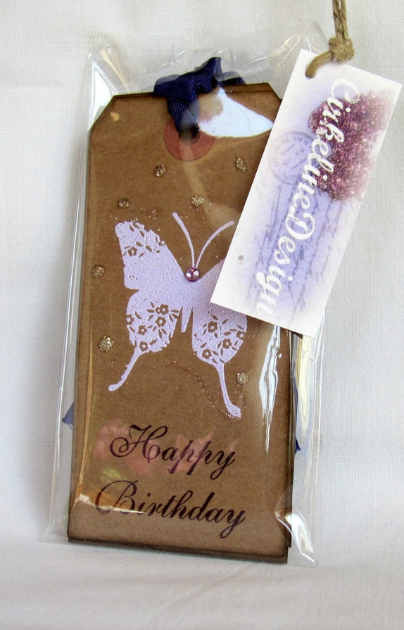 Gavelappene er dekorert med en embosset (forhøyet stempling) sommerfugl i lys lilla med bling og små dråper av glassglitter. "Happy birthday" er håndstemplet i mørk lilla. På baksiden er det stemplet "Til" og "Fra", og det er plass til å skrive en personlig hilsen. Mørk lilla sløyfebånd hører med.
