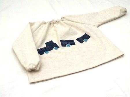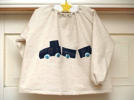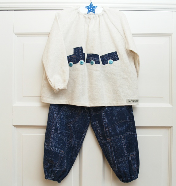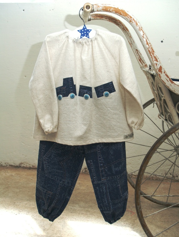 Genseren er sydd av gardiner i myk, ren bomull med lin-utseende. Pyntet med applikasjon av et tog, klippet fra samme dynetrekk som buksa er sydd av. Søte knapper utgjør hjulene på toget.