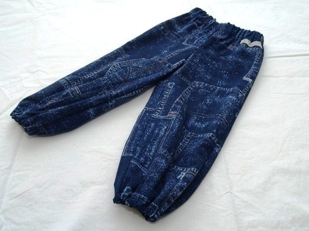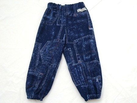Buksa er sydd av mykt dynetrekk med "dongeri-look". Buksa er sydd i str. 2 år (92 cm), men strikk i livet og i beina gjør at modellen kan brukes fra ca. 1 år og er fin å vokse i.