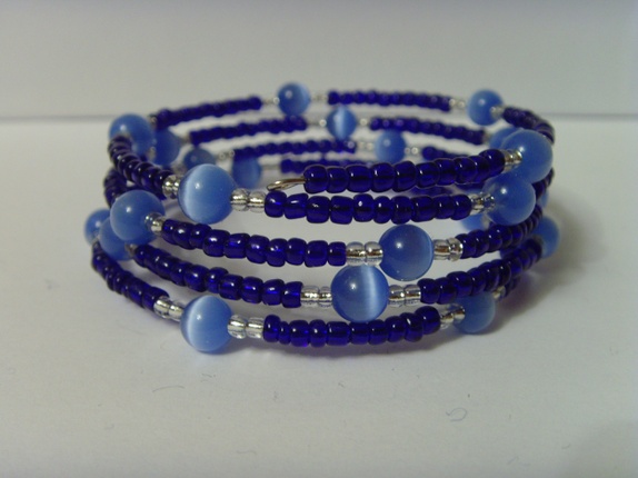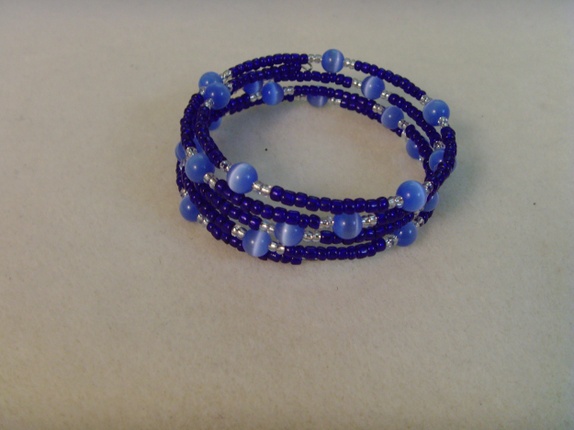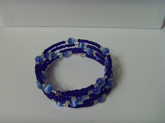 Armbåndet består av 4-5 ringer med memorywire, med sead-beads. Det er blå cat-eye perler med jevne mellomrom.