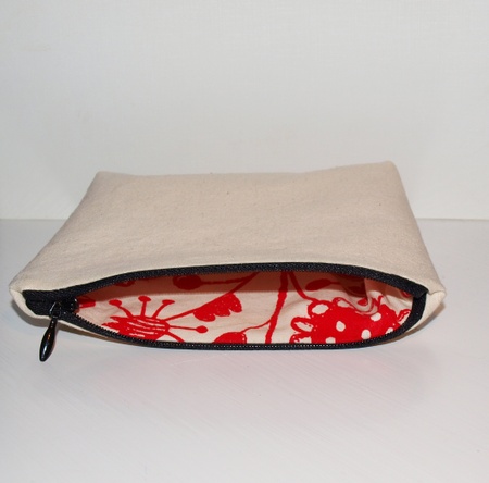 penge/sminke pung sydd av ubleket lerret stoff med print, foret med retro blomstret stoff.Vliselin mellom lagenebredde: 15 cmhøyde: 11 cm