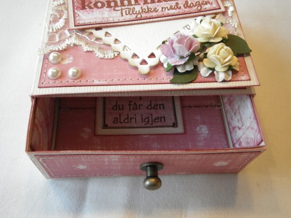 Pyntet med stempel, halvperler, blonde, maskinsøm og roser.