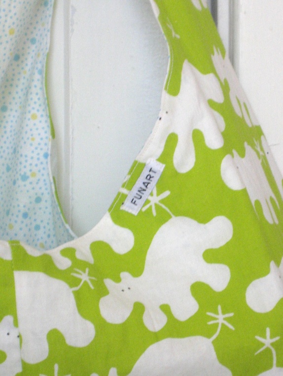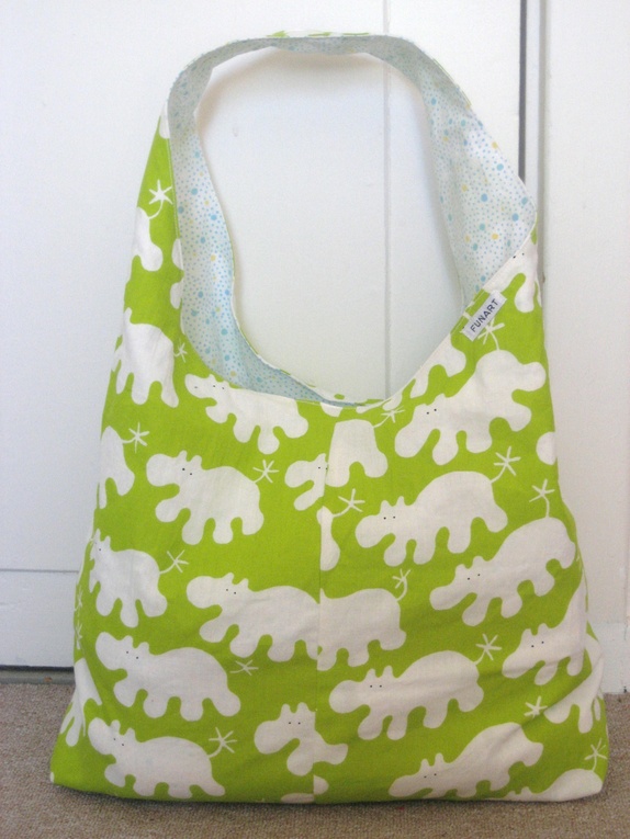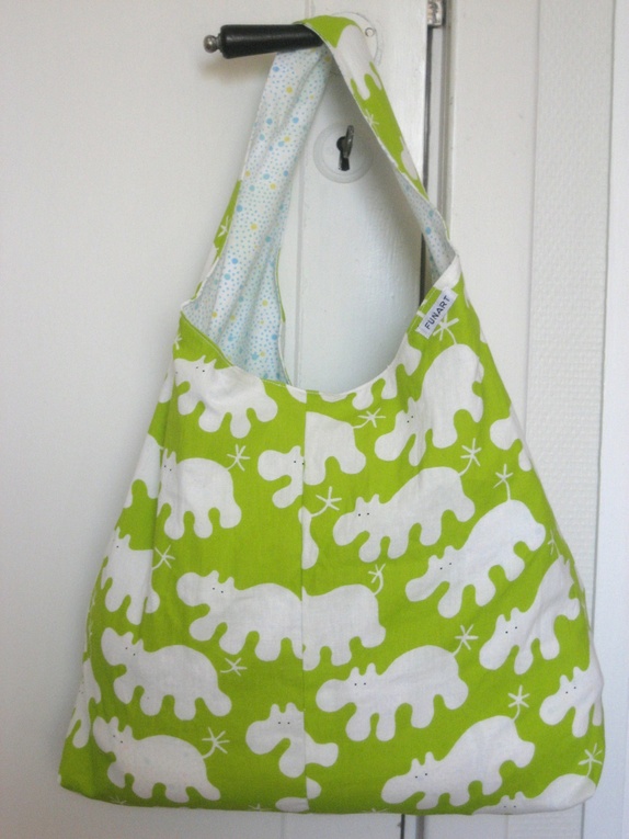 Herlig og friskt nett sydd i limegrønn bomull med flodhester, fòret med pastellprikkete bomull.