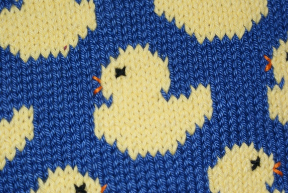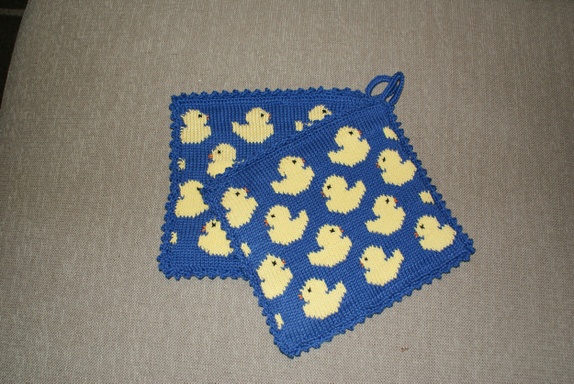 Håndstrikkede grytekluter i mykt bomullsgarn med koselig kyllingmønster. Gryteklutene er strikket dobbelt, med samme mønster på begge sider, så de er tykke og gode. De er også ganske store, 21x21 cm.