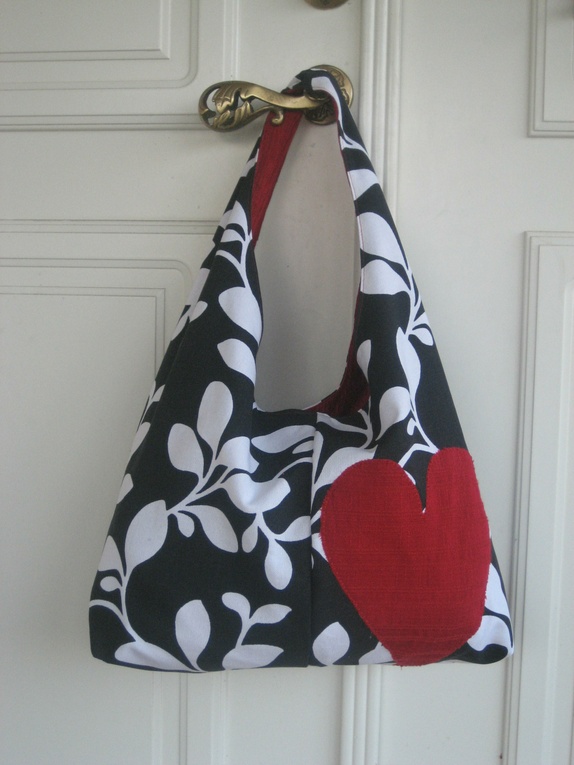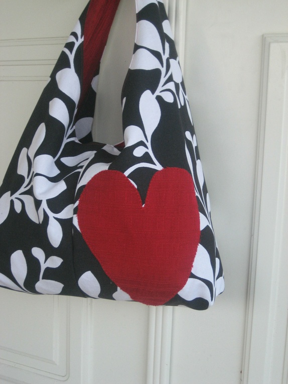 Flott veske/nett sydd i robust sort/hvit bomull, helfòret med rødt. Nettet har en stor rød hjerteapplikasjon.