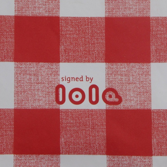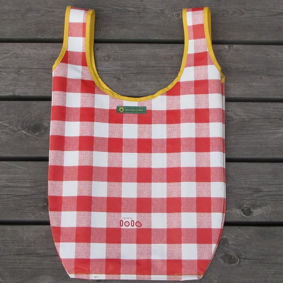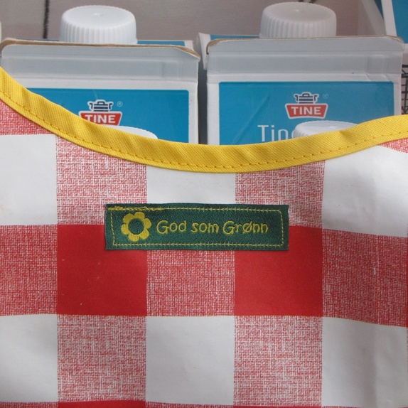 Sydd av rødrutete voksduk fra loppemarked og med kirsebærmønster og pyntet med detalj fra kjøkkenhåndkle i åprimærfargene som også er funnet på loppis. Gult skråbånd langs hankene. På baksiden er det lite God som Grønn-merke signed by lola som er en del av voksduken.