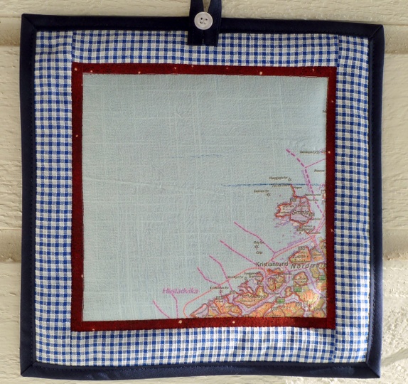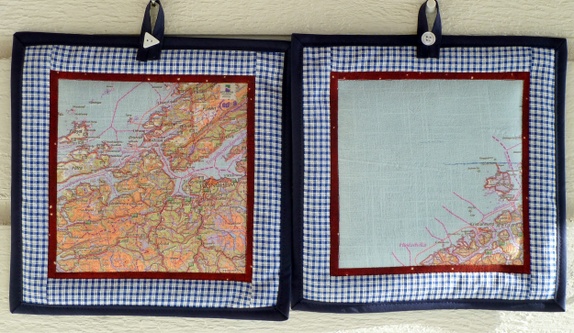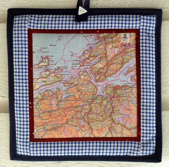 Motivet er decopage på lin. Karta viser Nordmøre og delar av Sør-Trøndelag. Kantar og bakstykke i bomull.Vattert og qullta i saumane.Storleik: 22 x 22 cm Prisen er pr. par.