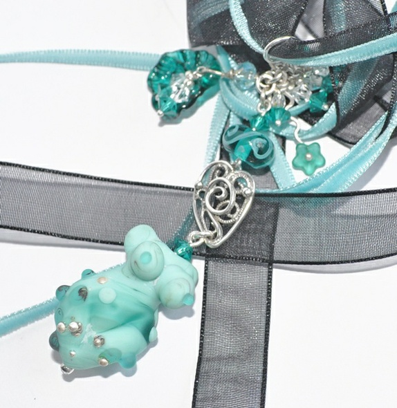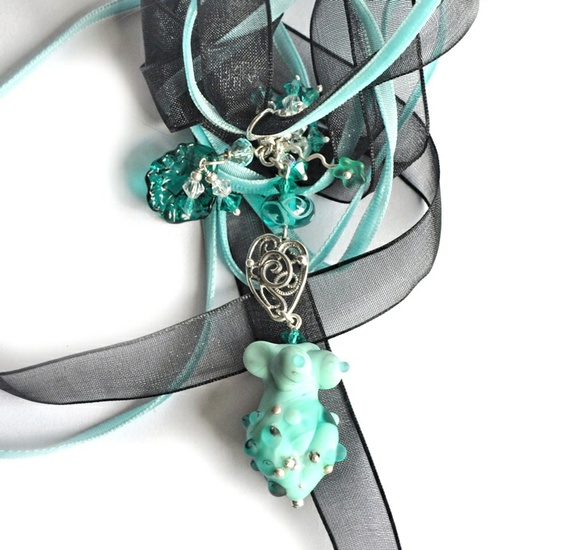 Jeg lager selv både filigransølvet, gudinnene og lampworkperlene, og denne leveres med både silkesnor og lærreim så du kan velge hva du vil bruke... eller begge.
