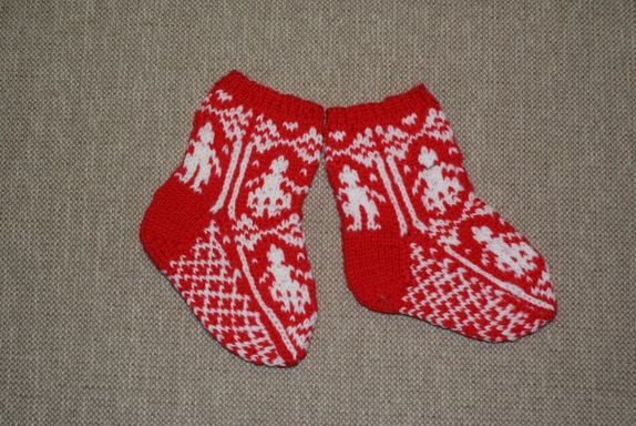 Håndstrikkede sokker i rødt og hvitt. Sokkene er strikket i babygarn i 100% ull med et morsom mann-og konemønster. Str. 6-12 mnd.
