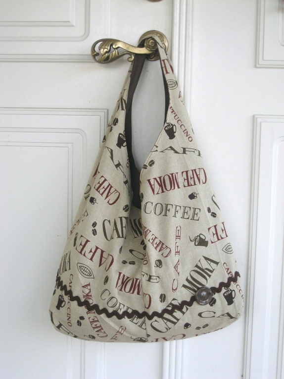 Flott veske/nett sydd i strie med kaffemønster, helfòret med brun bomull. Nettet er pyntet med brun kroklisse og en stor vintage knapp.