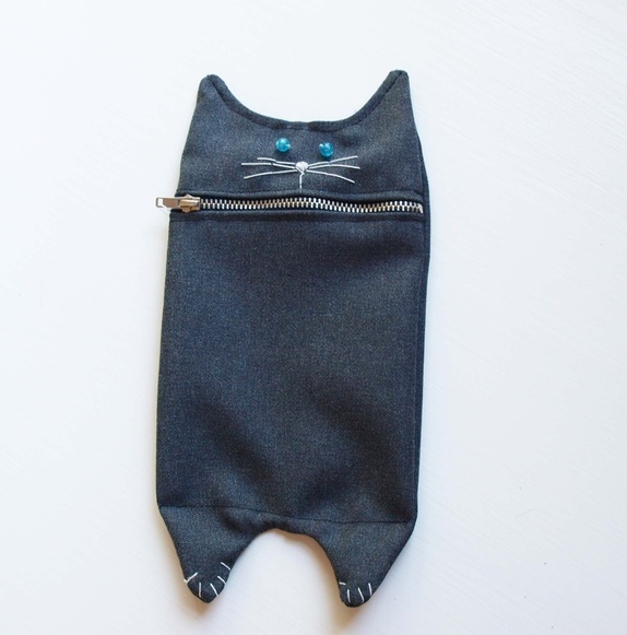 denne kan brukes til penger,briller, sminke etcsydd i grått stoff med glidelås som "munn"bredde:12 cmhøyde:25 cm