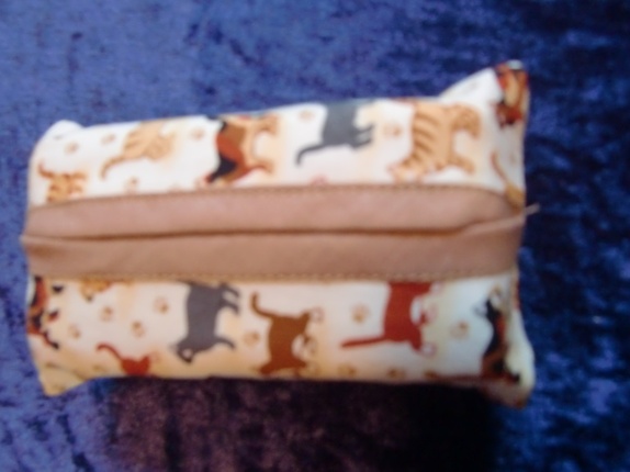 Ettui til papirlommetørklær. Plass til en pakke papir-lommetørklær str.8x12 cm (medfølger)Sydd i gode bomullstoffer- helforet.Mange glader katter med halen i været.