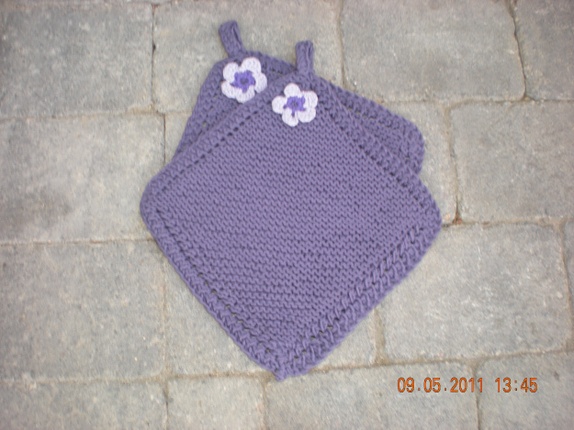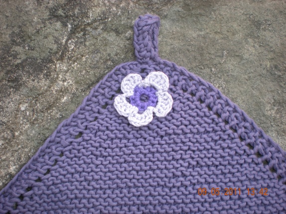 Deilig grytekluter i bomullsgarn til små og store kokker.Gryteklutene er pyntet med en blomst og har en hempe. Farge: lillaMandarin Soft garn 100% bomullLengde ca 24x24 cm.