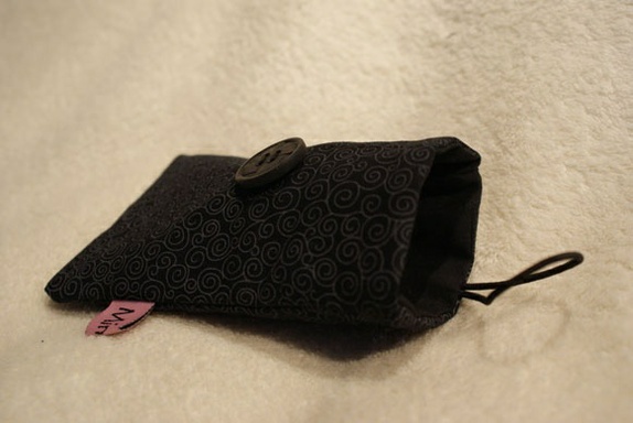 Lukkes med en svart elastisk snor og en svart nøytral knapp.