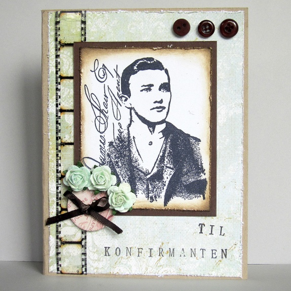 Det er pyntet med designpapir i en blek blågrønn farge, et håndstemplet vintage motiv av en ung mann, en filmstripe, roser og knapper. "Til konfirmanten" er håndstemplet i gammeldags skrivemaskinskrift.