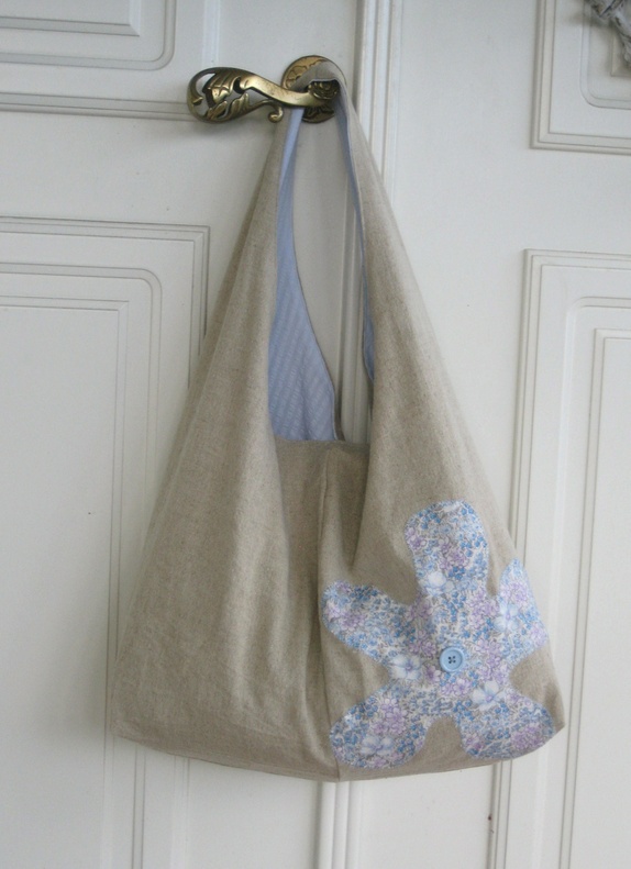 Vakkert og delikat nett/veske sydd i lin, helfòret med lys blå kreppbomull. Nettet er pyntet med en stor blomst og en knapp.