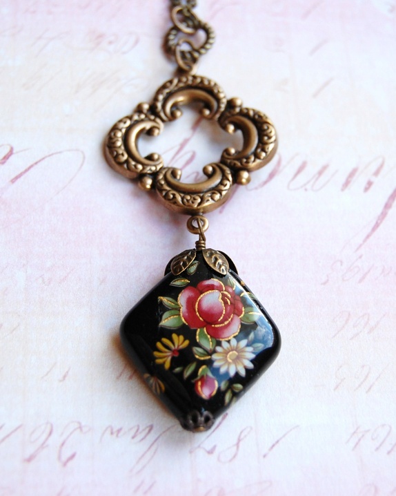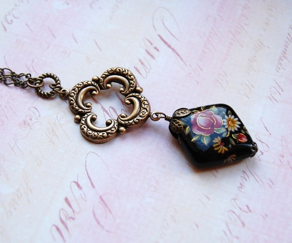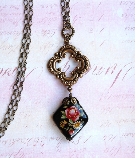 Rose kjede med lang lenke.Kløveranheng med sort tenshaperle med rosedekal.Anhenget måler ca 7.3 * 3 cm.Lengden på lenka er ca 70 cm.