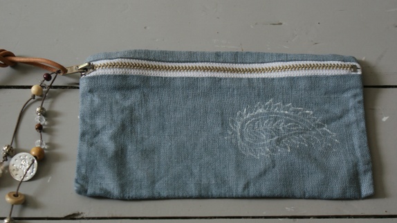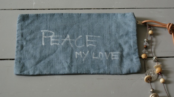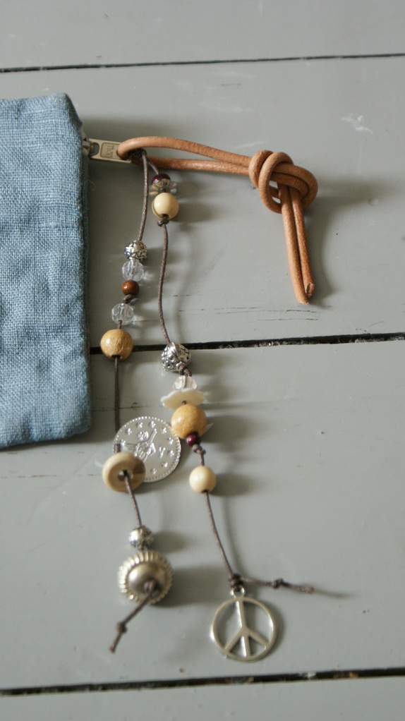 Laget av lin, fôr er av bomull. Håndfarget og med trykket-og/eller skrevet dekor på. Skinn stråp som bare blir finere og finere ved bruk. 2 x snorer med forskjellige perler/ stener/ tegn etc.