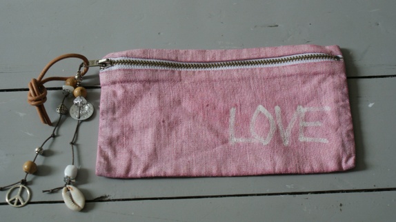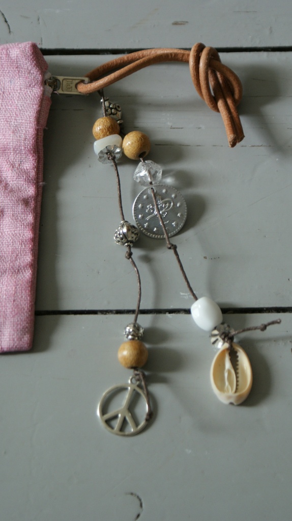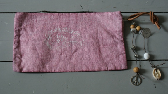 Laget av lin, fôr er av bomull. Håndfarget og med trykket-og/eller skrevet dekor på. Skinn stråp som bare blir finere og finere ved bruk. 2 x snorer med forskjellige perler/ stener/ tegn etc.